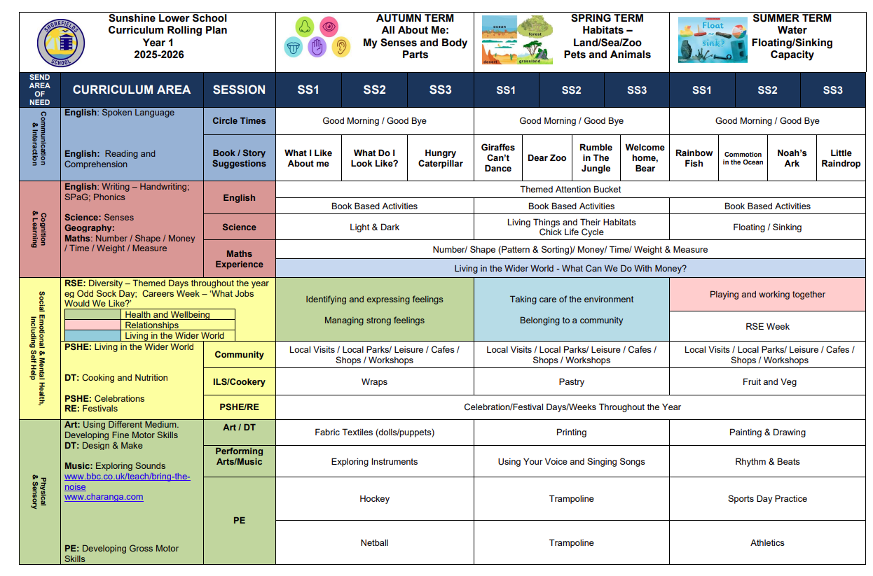In Sunshine Classes the curriculum is topic based ensuring links to national curriculum for English, Maths and Science are implemented as well as catering for the individual needs of the students. Our curriculum is based on a combination of knowledge and skills. We want our students to develop meaningful and functional knowledge and skills that will support their adult life. Cookery, gardening, art, phonics, reading, PSHE and RSE also form part of the weekly timetable with the work differentiated according to the needs of the student. For each student their next step will be based on their assessed previous skills and knowledge rather than for their age or year group, it will be highly personalised.
